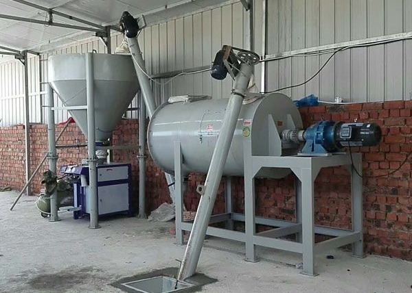 The well-mixed materials will go into the storage bin via material conveying pipe, and the mixer may be feed consecutively and work continuously in flow line production,
